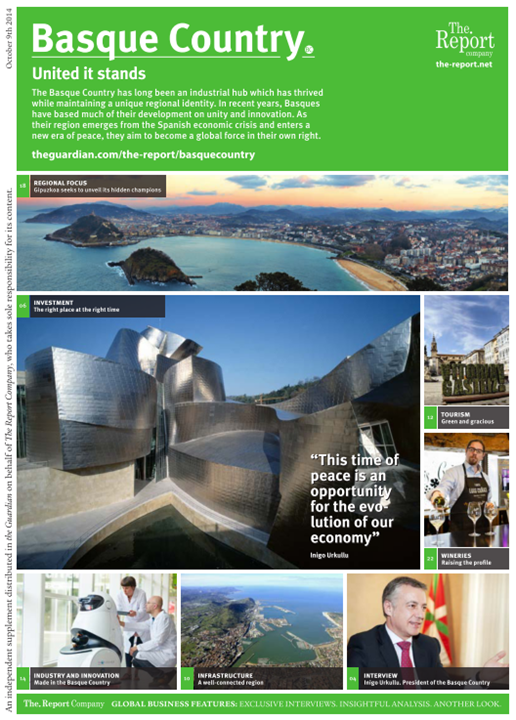 El periódico "The Guardian" publica un reportaje realizado por "The Report Company" dedicado al País Vasco en el que podemos encontrar una serie de artículos que tratan sobre la inversión, la energía, industria e innovación, las infraestructuras, el turismo, la cultura, etc., así como exclusivas entrevistas realizadas a diferentes personalidades del País Vasco. Entre ellas, encontraremos la entrevista realizada a Jon Azua, Presidente de E-novatinglab, sobre el desarrollo económico industrial del País Vasco en los últimos tiempos así como su visión sobre el porvenir.